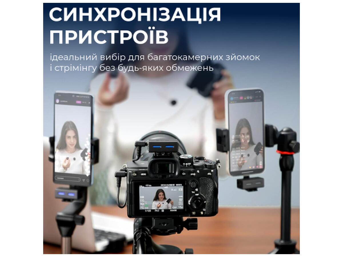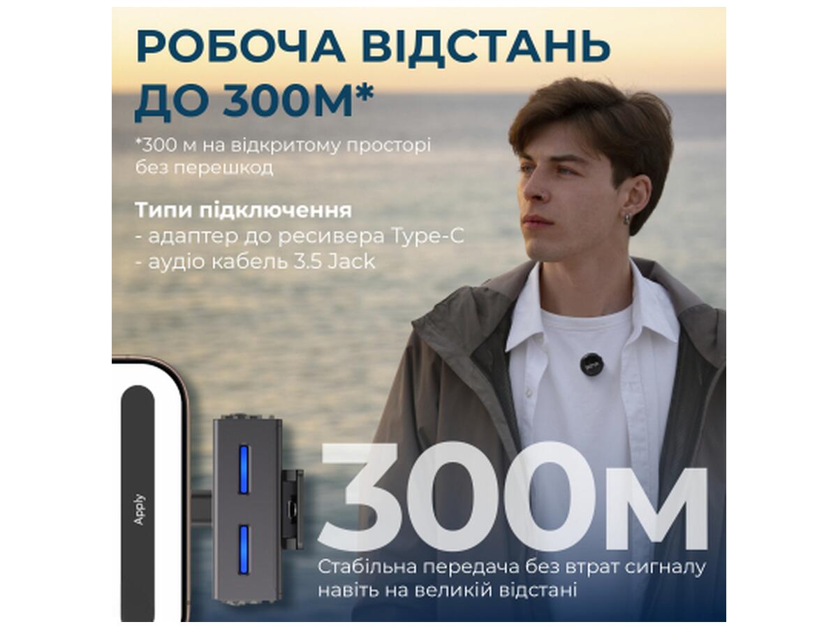 - Подключение к любому устройству: Приемник имеет сменные адаптеры (USB-C, Lightning, 3.5 мм TRS), что позволяет записывать на камеры, смартфоны, планшеты и ПК. Живой мониторинг через разъем 3.5 мм: Контролируйте звук в реальном времени во время записи.