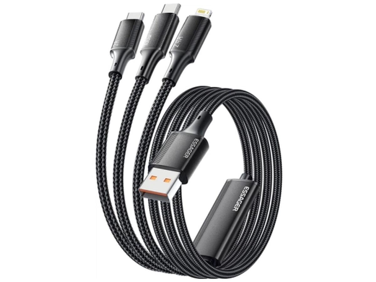 Кабель Essager 3 в 1 отличается широкой совместимостью. С его помощью можно заряжать смартфоны iPhone, Xiaomi, Huawei, Samsung и OPPO, планшеты, внешние аккумуляторы и настольные вентиляторы.