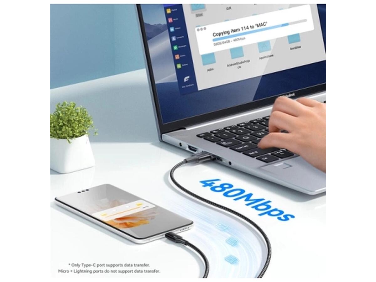 Кабель длиной 1.2 метра имеет три разъема: USB Type-A для USB Type-C, Lightning и Micro USB, что обеспечивает совместимость с широким спектром гаджетов. Благодаря крепкой конструкции из алюминиевого сплава и прочного оплетения, кабель обеспечивает долговечность и надежность. Кроме того, кабель поддерживает скорость передачи данных до 480 Мбит/с.