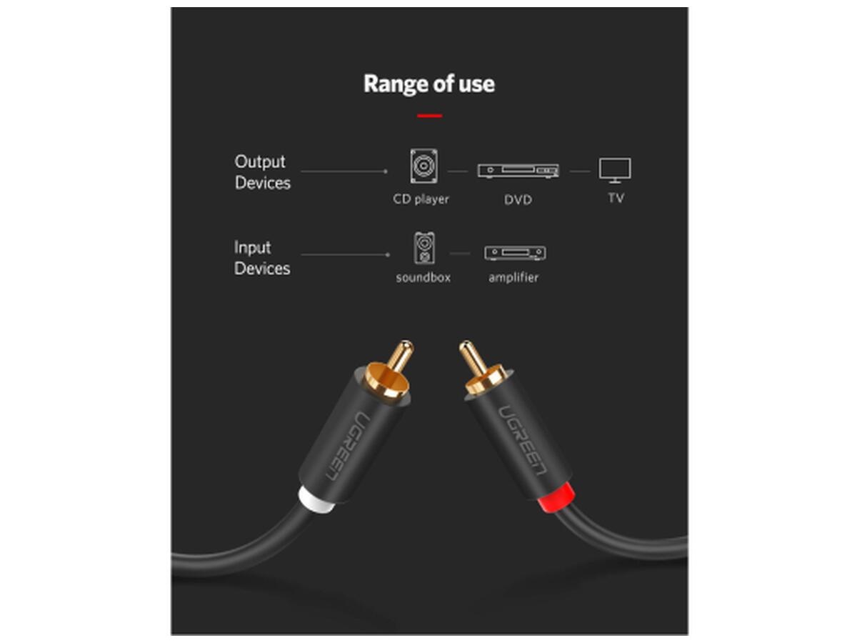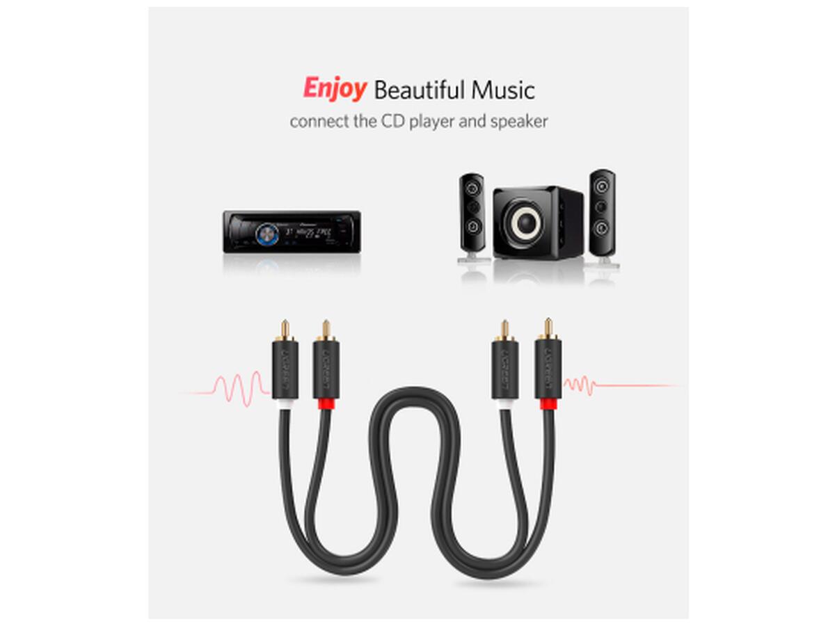 UGREEN AV104 2RCA to 2RCA Audio Cable – стереофонический аудиокабель – хороший выбор для домашнего кинотеатра, HDTV, игровых консолей, систем hi-fi, усиливая качество звука для более приятного звучания. Позолоченные коннекторы предназначены для улучшения передачи аудиосигнала и уменьшения помех. RCA – отличная альтернатива для аудио/видео устройств, где новые типы соединений недоступны.