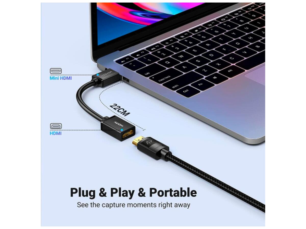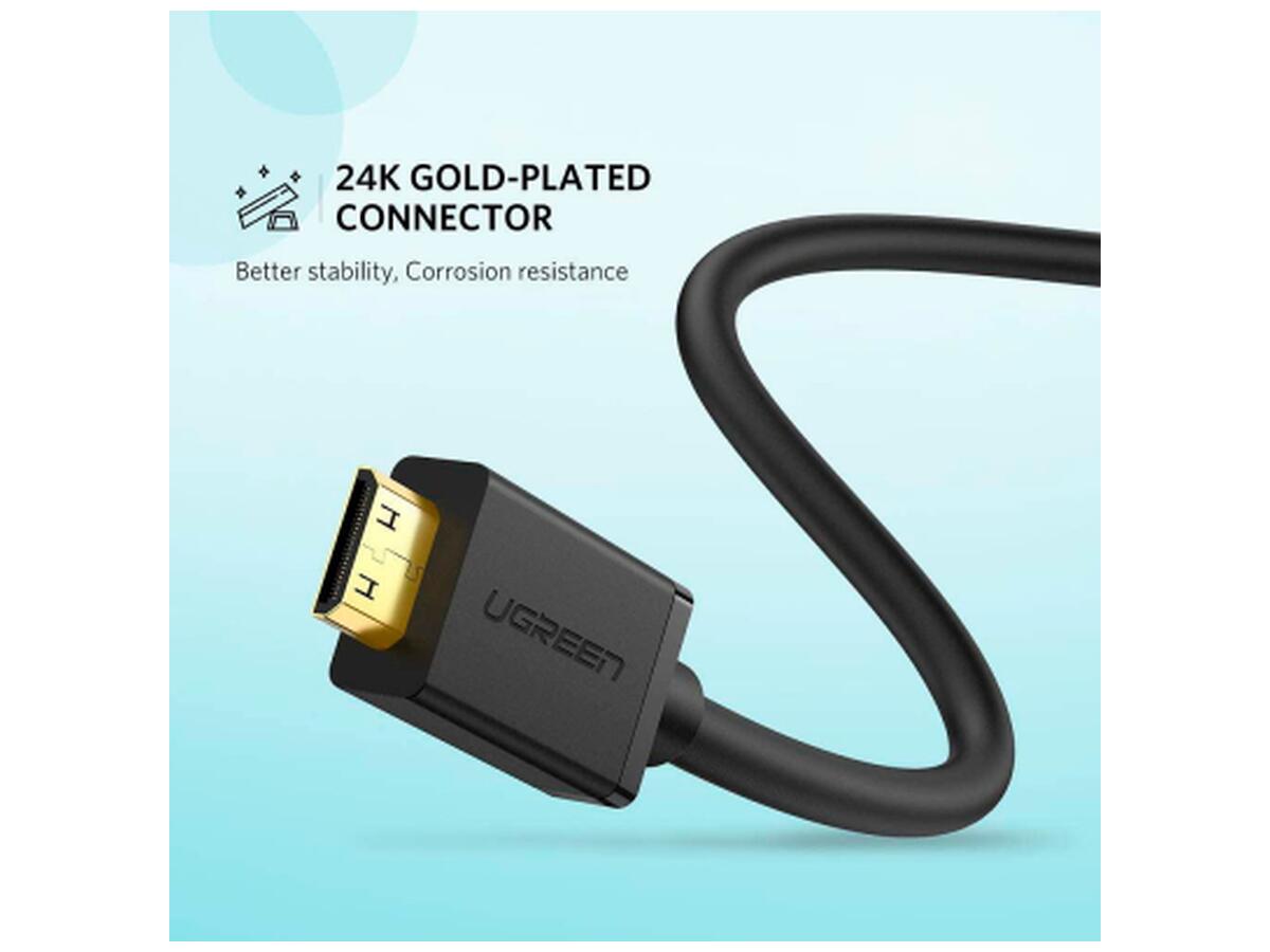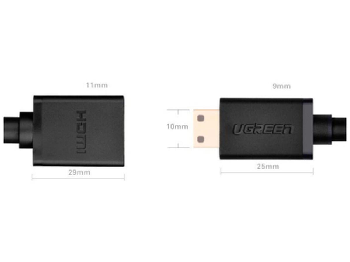 С одной стороны у переходника Ugreen mini HDMI Male to HDMI Female Adapter Cable Black коннектор mini HDMI, который вы можете подключить к фотоаппарату, видеокамере, планшету, ноутбуку и другому гаджету с таким разъемом. С другой стороны – коннектор HDMI, подключаемый к монитору или телевизору. Позолоченные контакты обеспечивают стабильный сигнал.