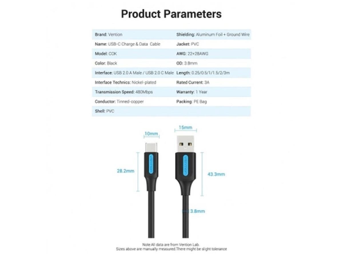Дата кабель USB 2.0 AM to USB-C 1.5m 3A black Vention (COKBG)