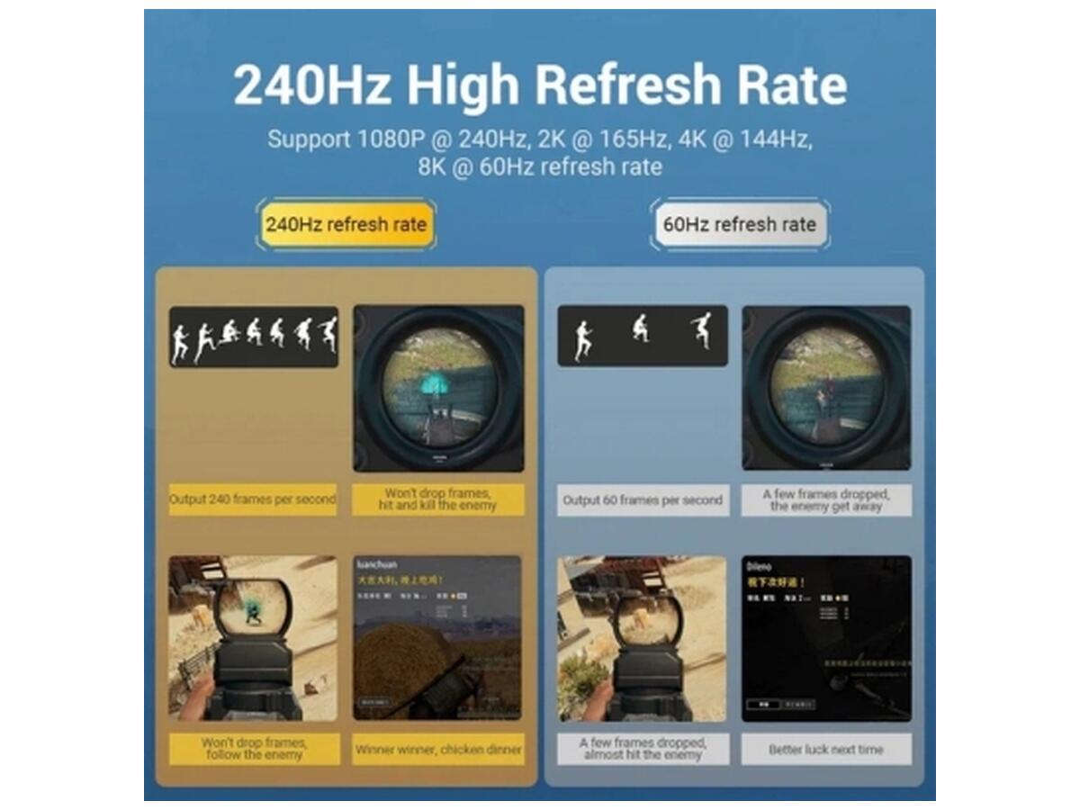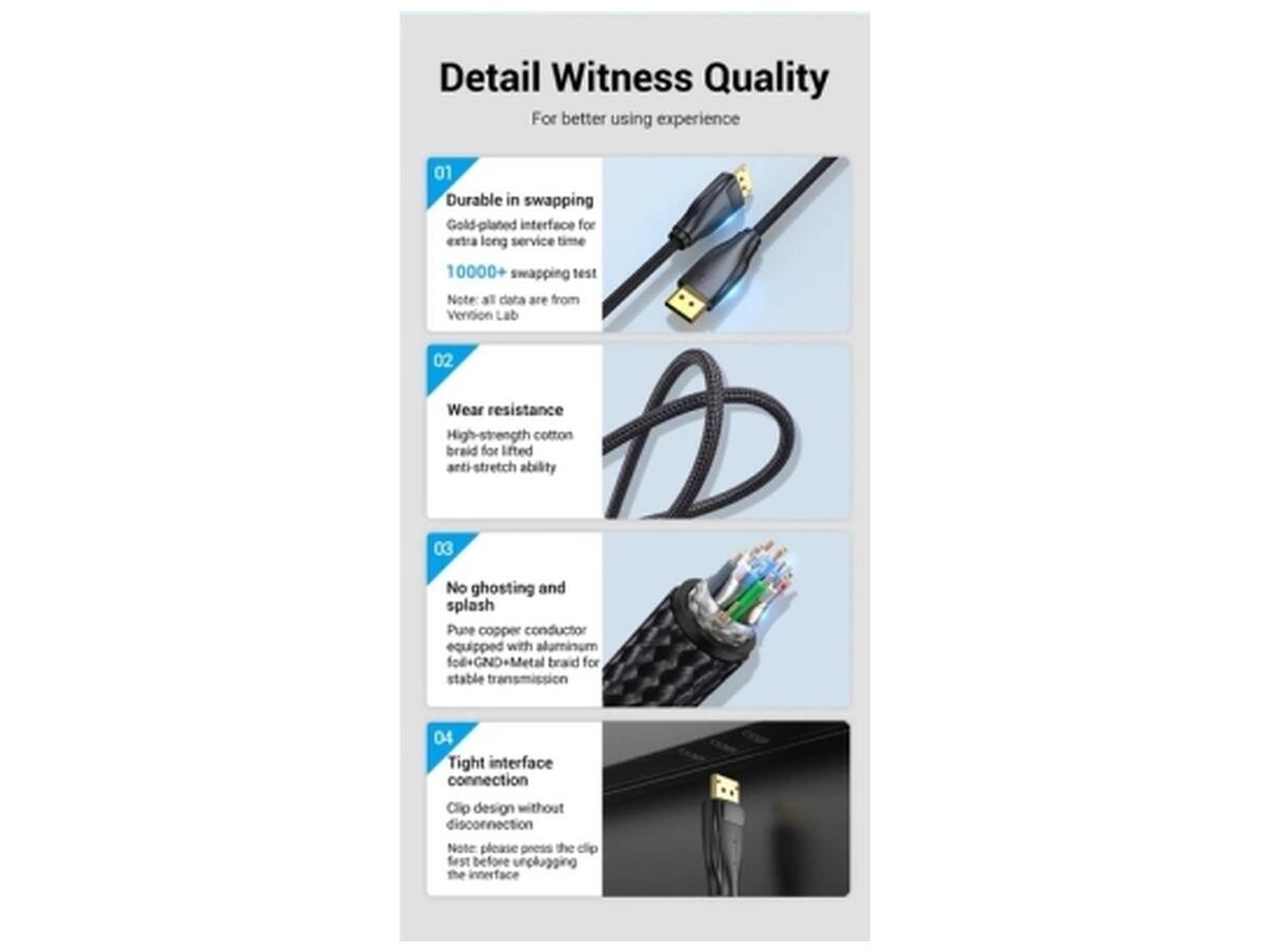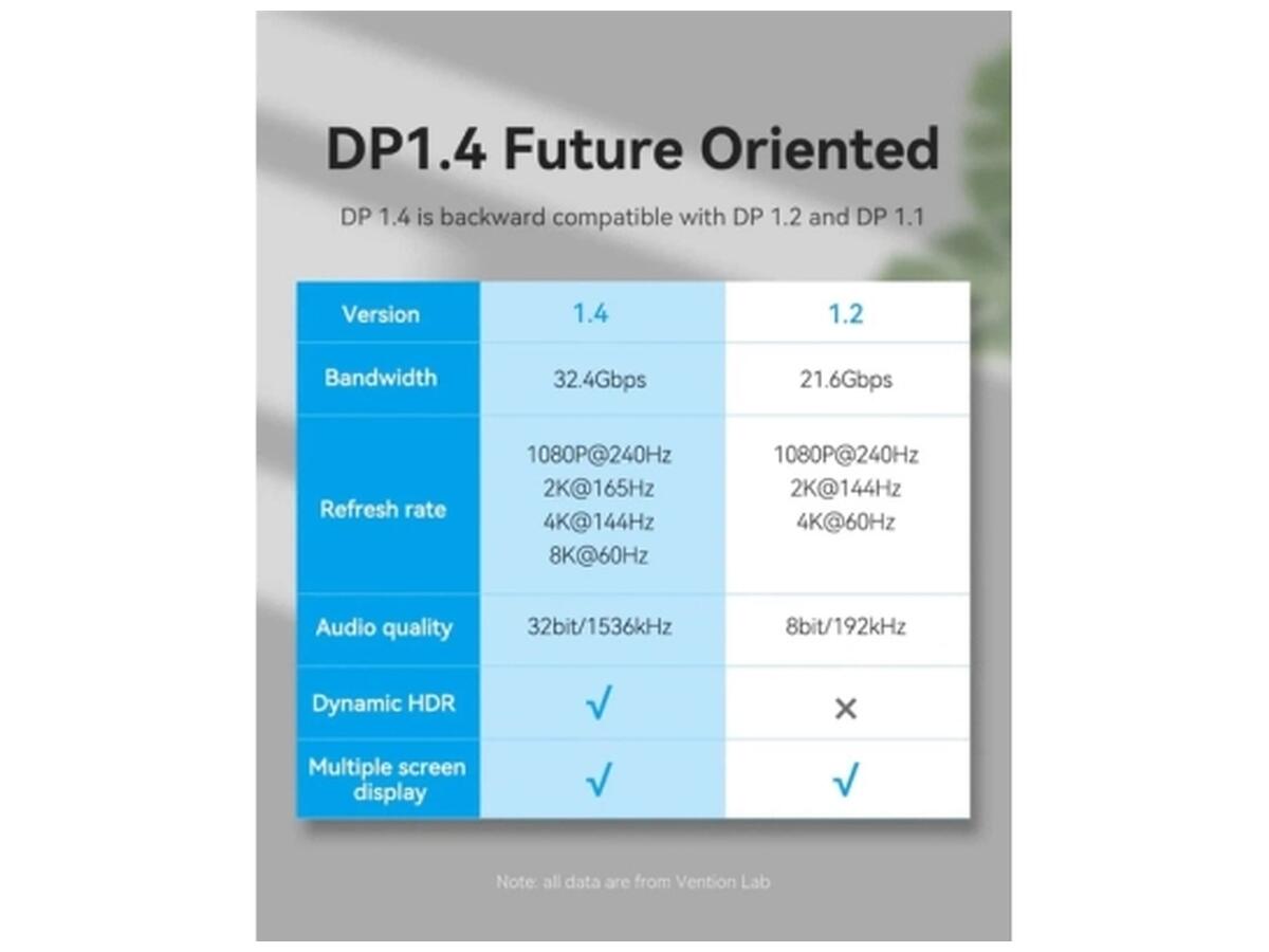 Цифровий кабель DisplayPort 1.4 для підключення джерела відео та пристрою відображення. Ідеально підходить для передачі високої роздільної здатності 8K Ultra HD (7680x4320 при 60 Гц) і має пропускну здатність до 32,4 Гбіт/с, а також підтримує понад 32 аудіоканали. Кабель дозволяє переключати пристрої через роз'єм DisplayPort. Зазвичай кабель необхідний для підключення дисплея до вашого комп'ютера або аудіо- та відеообладнання з сучасним інтерфейсом DisplayPort. Підтримка: 8K 60 Гц / 4K 144 Гц / 2K 165 Гц / 1080p 240 Гц / динамічний HDR / PLCM / AC-3 / DTS та інші аудіоформати