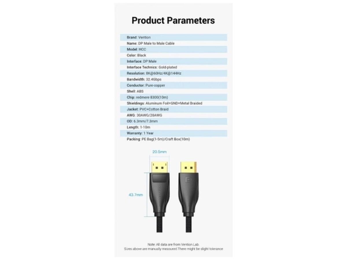 | Краткие характеристики | Производитель: Vention Артикул: HCCBI Тип коннектора 1: DisplayPort Тип коннектора 2: DisplayPort Длина: 3 м Особенности: 8K 60Hz Страна производства: Китай |