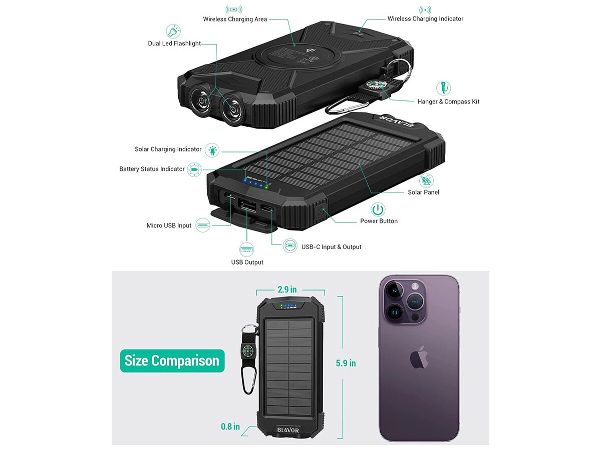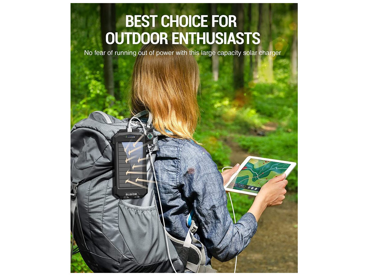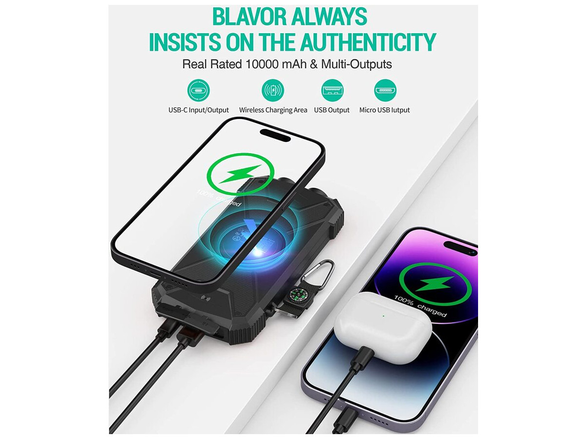 Багатоцільовий зовнішній акумулятор: портативний сонячний зарядний пристрій BLAVOR виконаний у водонепроникному, пиленепроникному та удароміцному корпусі за стандартом IPX5. Вбудований подвійний надяскравий ліхтарик і карабін для компаса, що входить до комплекту, забезпечать вашу безпеку під час подорожей на відкритому повітрі й стануть ідеальним компаньйоном для любителів активного відпочинку.