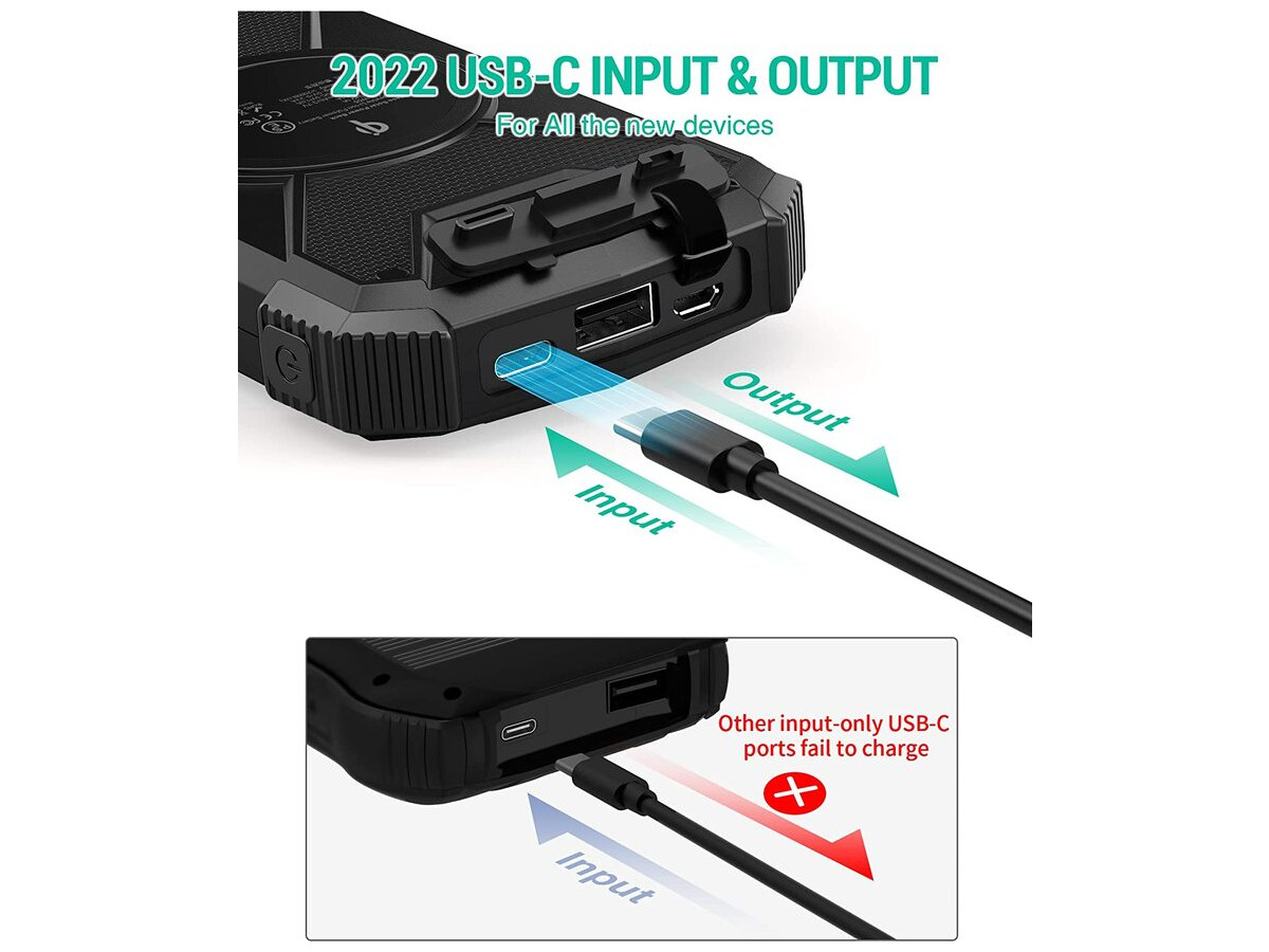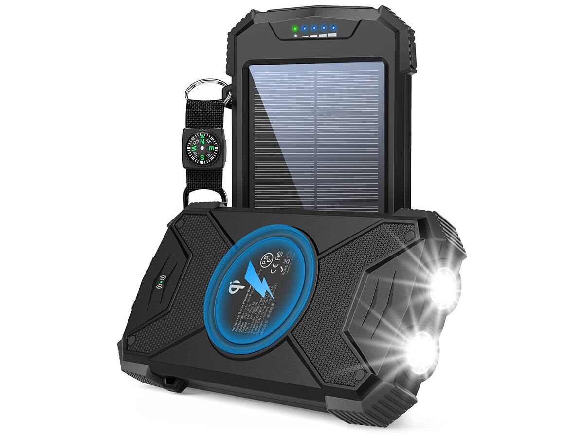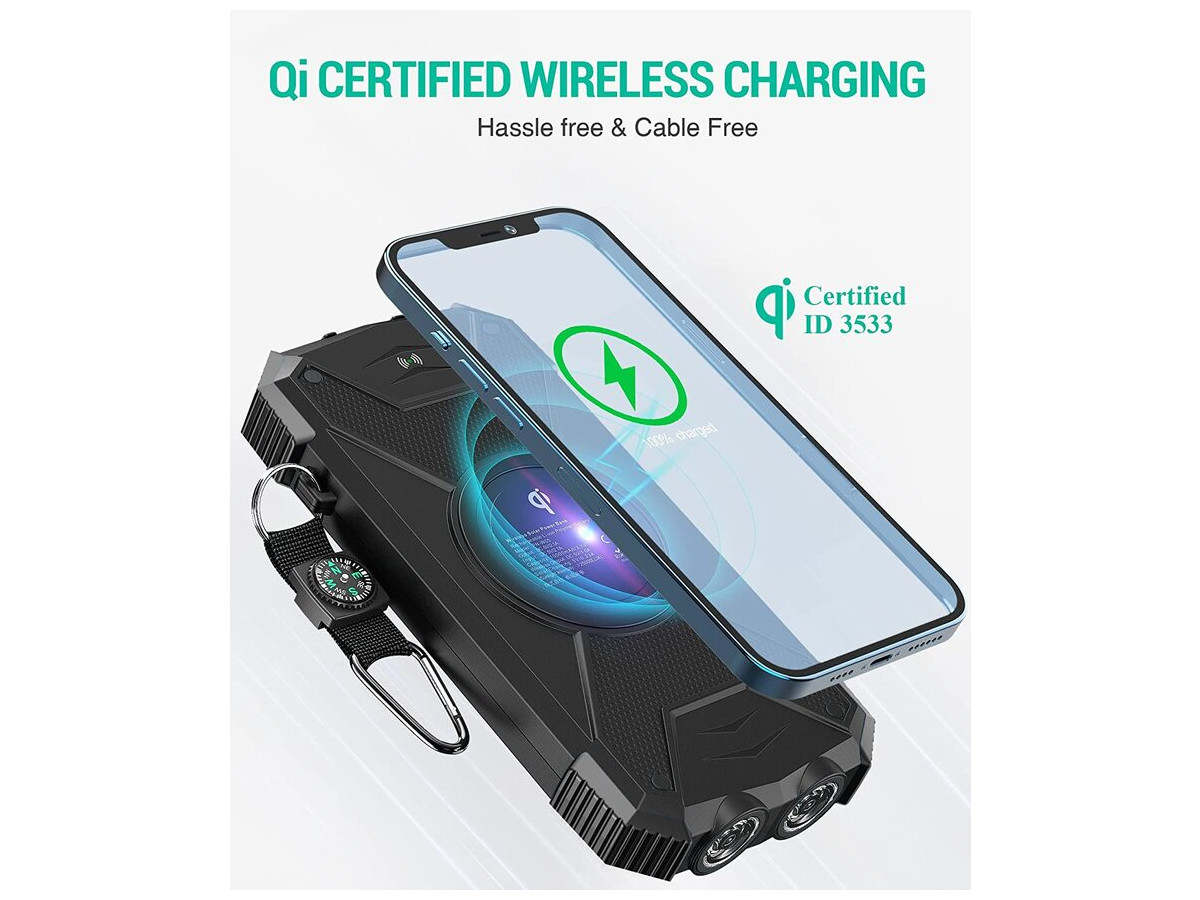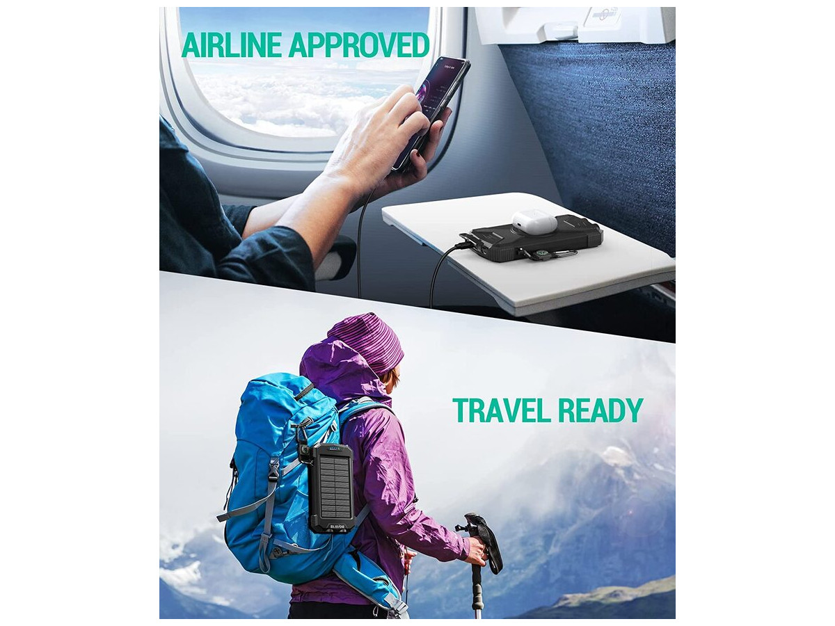 Багатоцільовий зовнішній акумулятор: портативний сонячний зарядний пристрій BLAVOR виконаний у водонепроникному, пиленепроникному та удароміцному корпусі за стандартом IPX5. Вбудований подвійний надяскравий ліхтарик і карабін для компаса, що входить до комплекту, забезпечать вашу безпеку під час подорожей на відкритому повітрі й стануть ідеальним компаньйоном для любителів активного відпочинку.