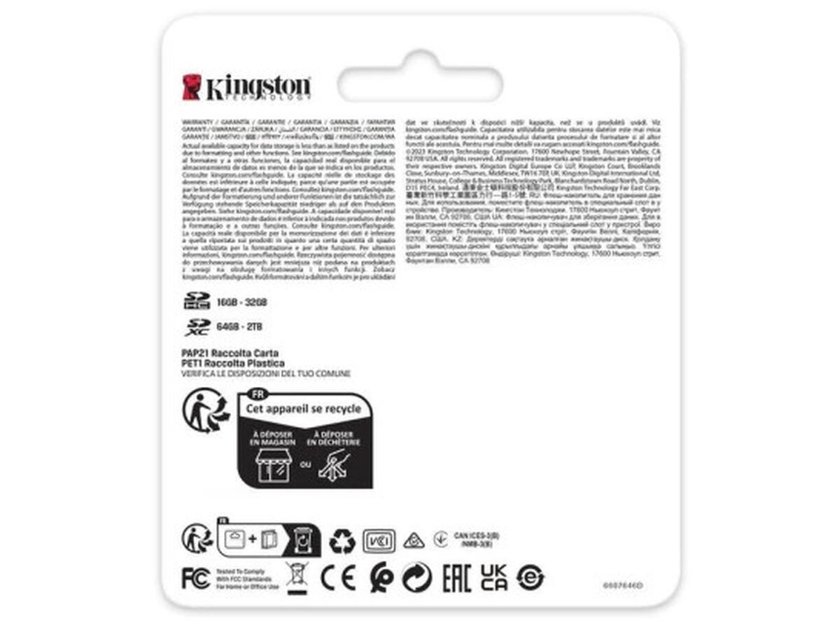 Технології Kingston гарантують тривалий термін служби пристрою за будь-яких умов експлуатації. Відсутність адаптера робить карту зручною для прямого використання у сумісних пристроях.