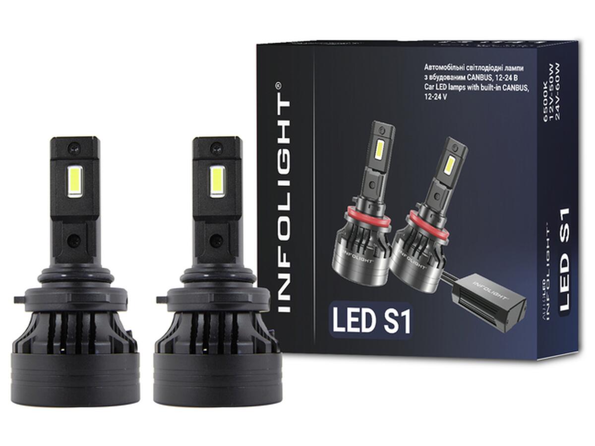 Перед вами сучасний комплект LED ламп Infolight S1 з цоколем 9006 (HB4), який призначений для головного світла автомобіля. Ці лампи відзначаються компактністю і простотою встановлення у стандартний роз'єм. Завдяки сучасним GXP LED чіпам, вони забезпечують яскравий світловий потік до 10000 люмен при потужності 50 Вт, з холодним білим світлом температурою 6500K.