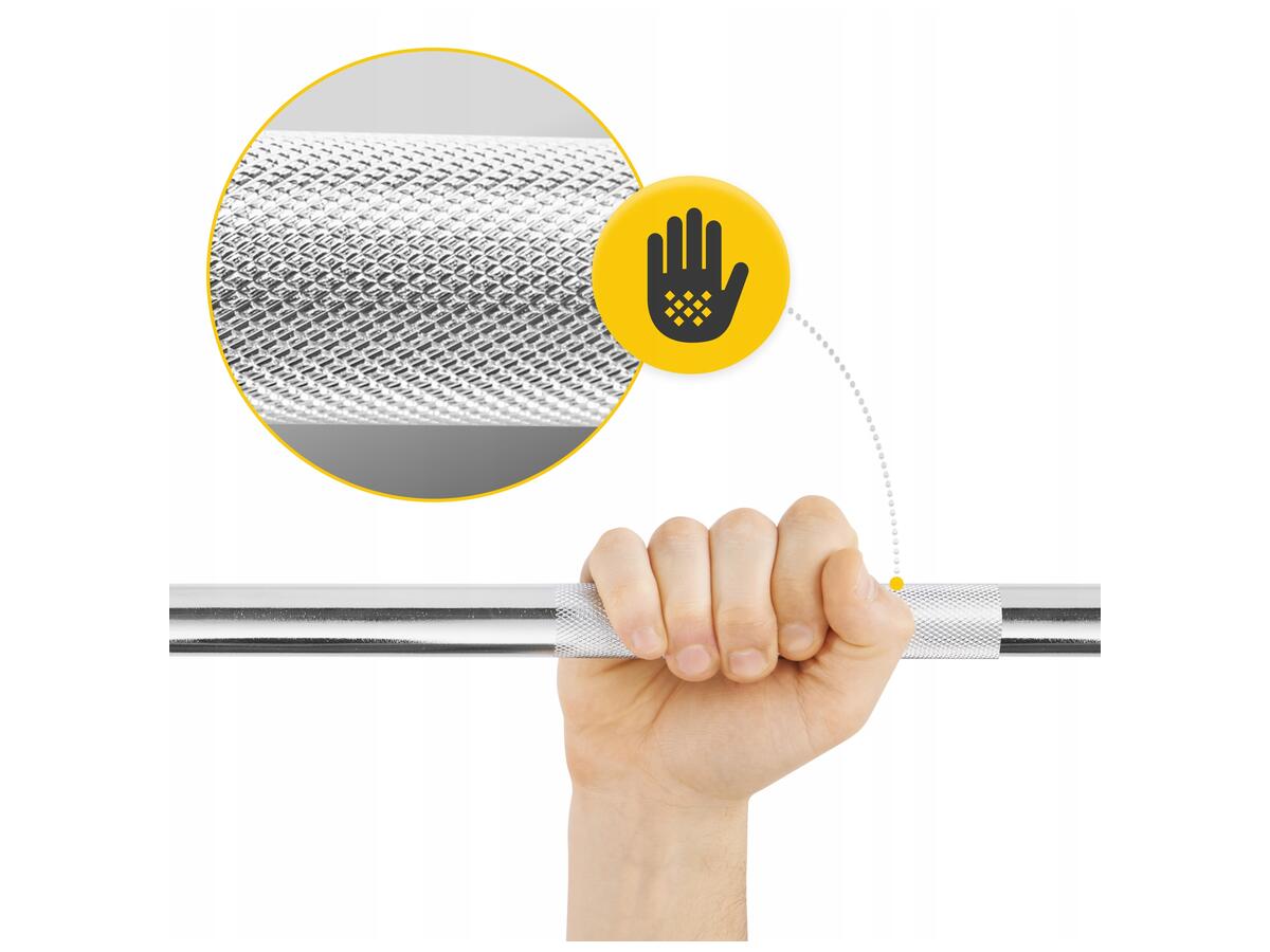 Виготовлений із хромованої сталі, цей гриф має тривалий термін служби та витримує великі навантаження. Спеціальна насічка на зоні захоплення забезпечує надійне утримання грифа навіть при вологих руках, запобігаючи ковзанню.