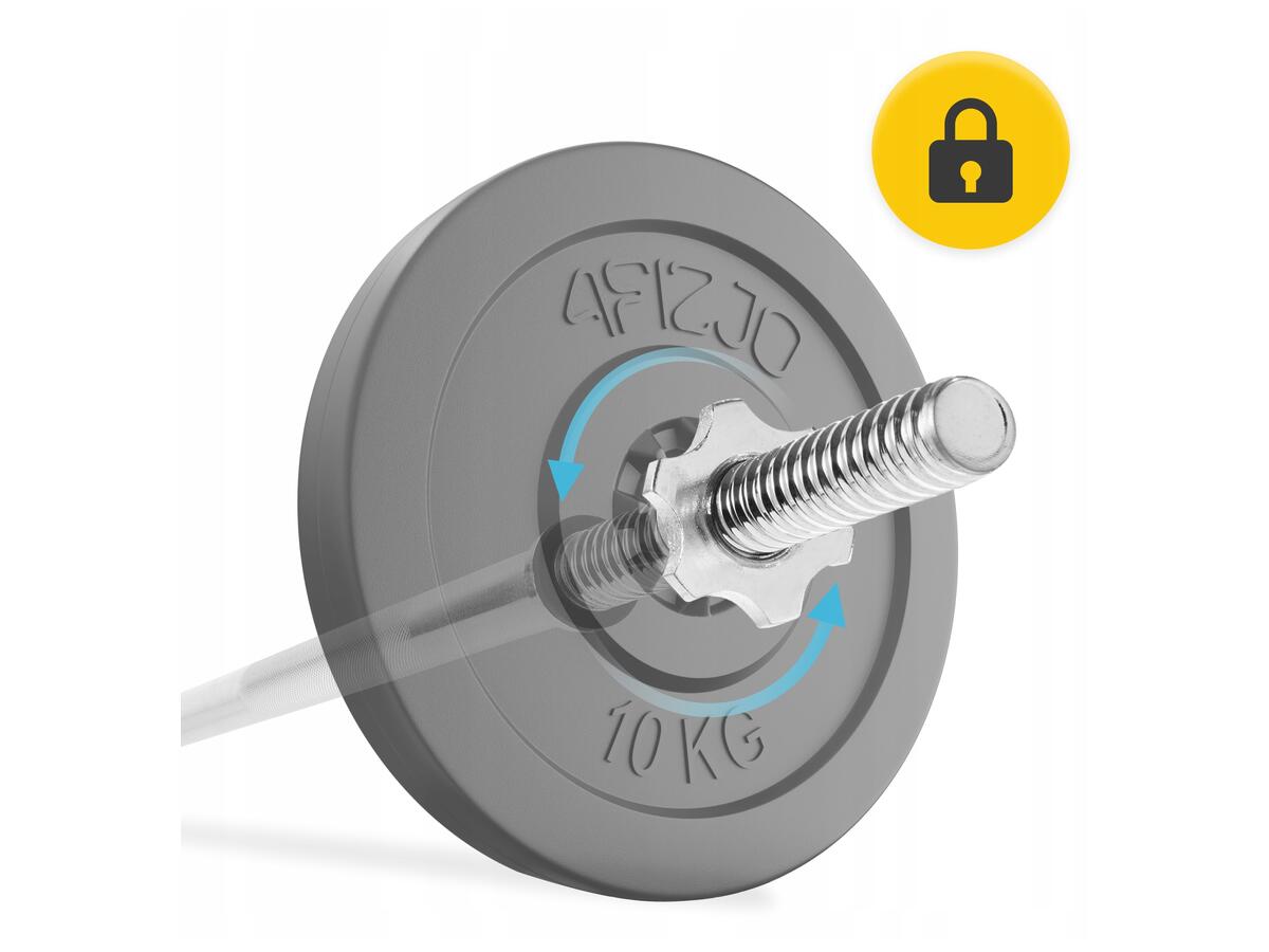 Для безпеки під час тренувань застосовані різьбові замки з гумовими ущільнювачами, які міцно утримують диски і виключають розгойдування навантаження. Компактність і якість виробу роблять його чудовим вибором для тих, хто прагне підтримувати чудову фізичну форму вдома.