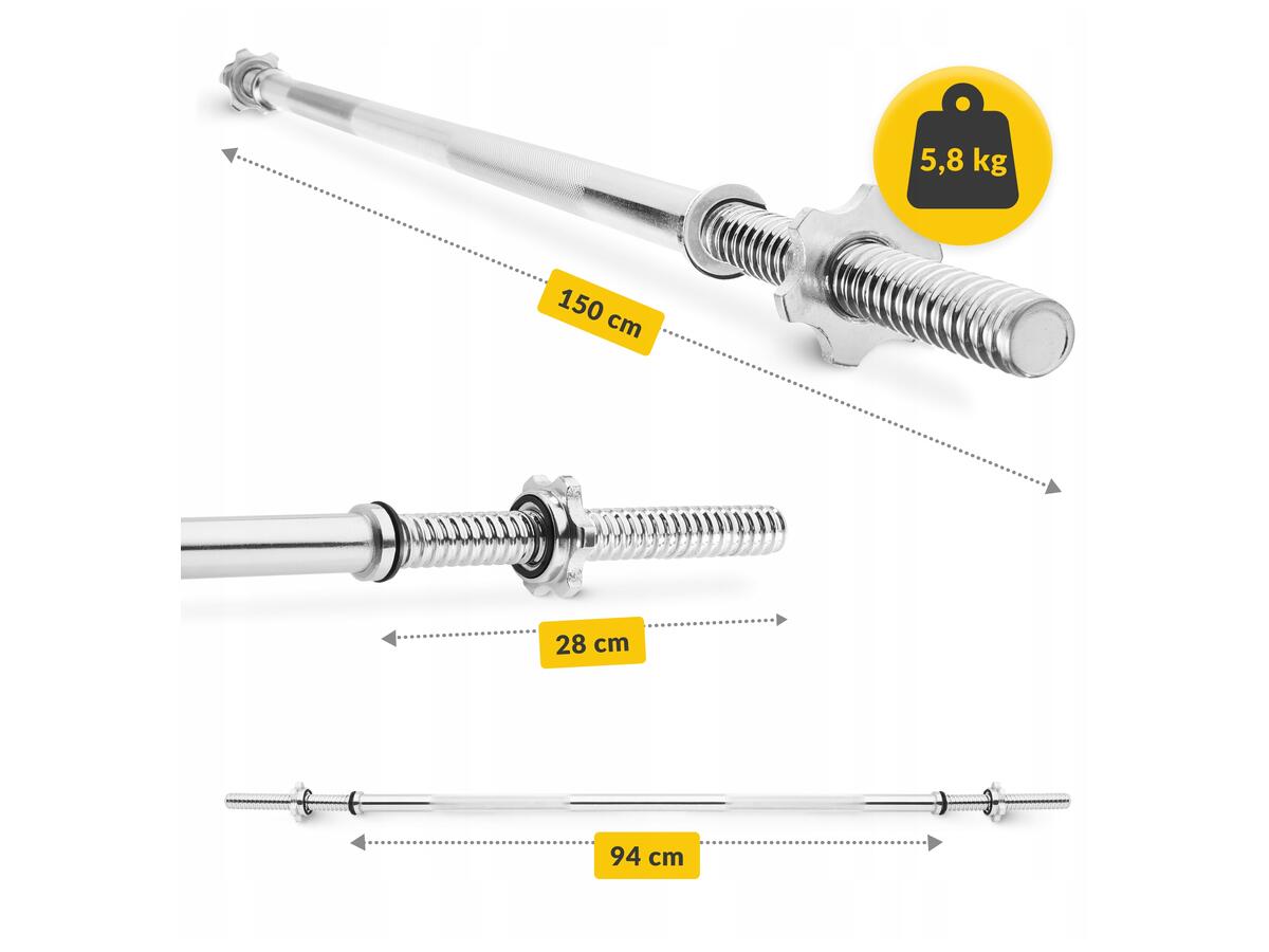 Ефективний і компактний гриф довжиною 150 см призначений для якісних силових вправ як удома, так і у спортзалі. Виготовлений з міцної хромованої сталі, він гарантує тривалий термін служби та стійкість до навантажень.