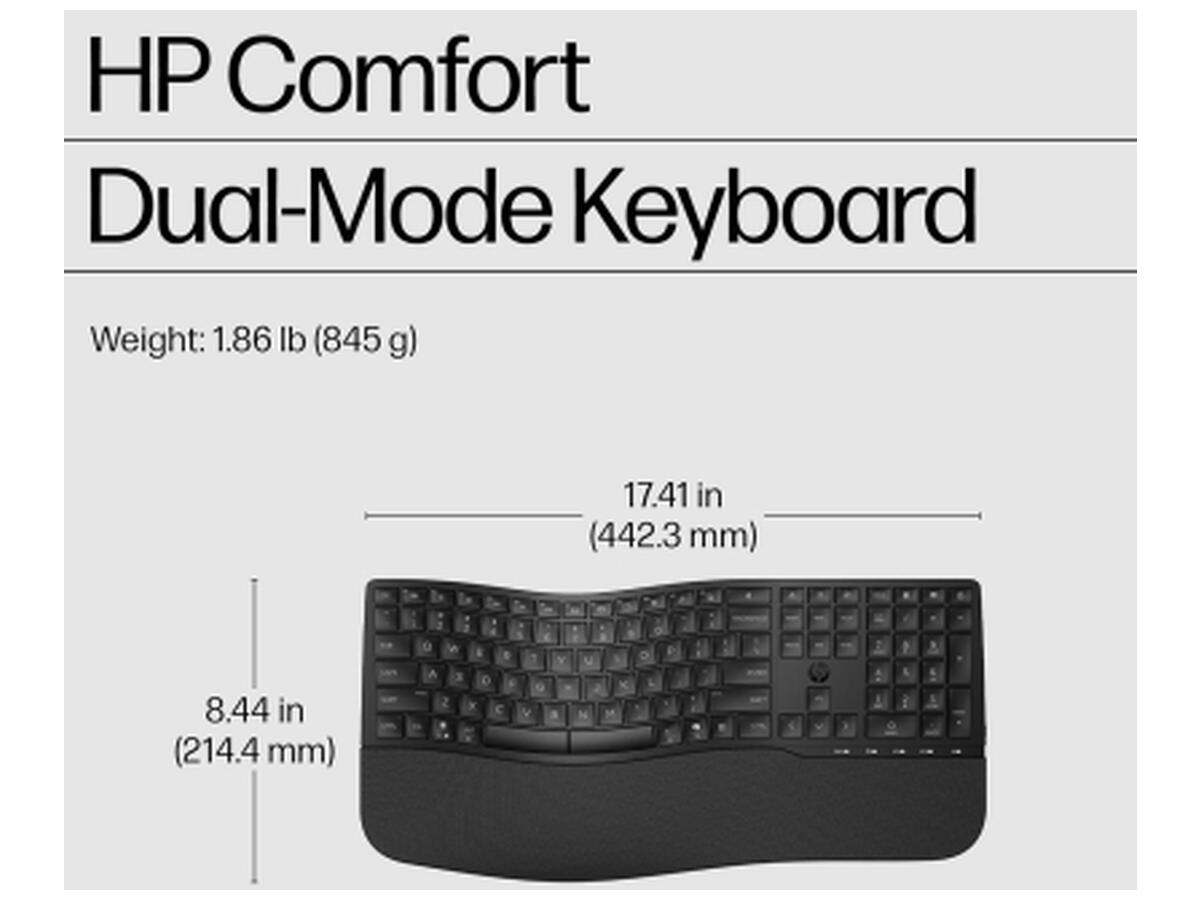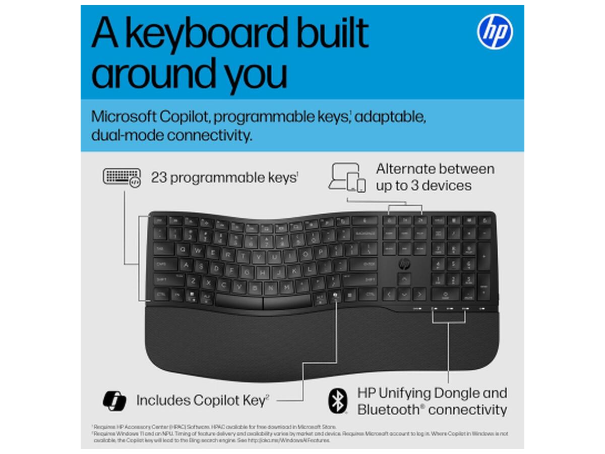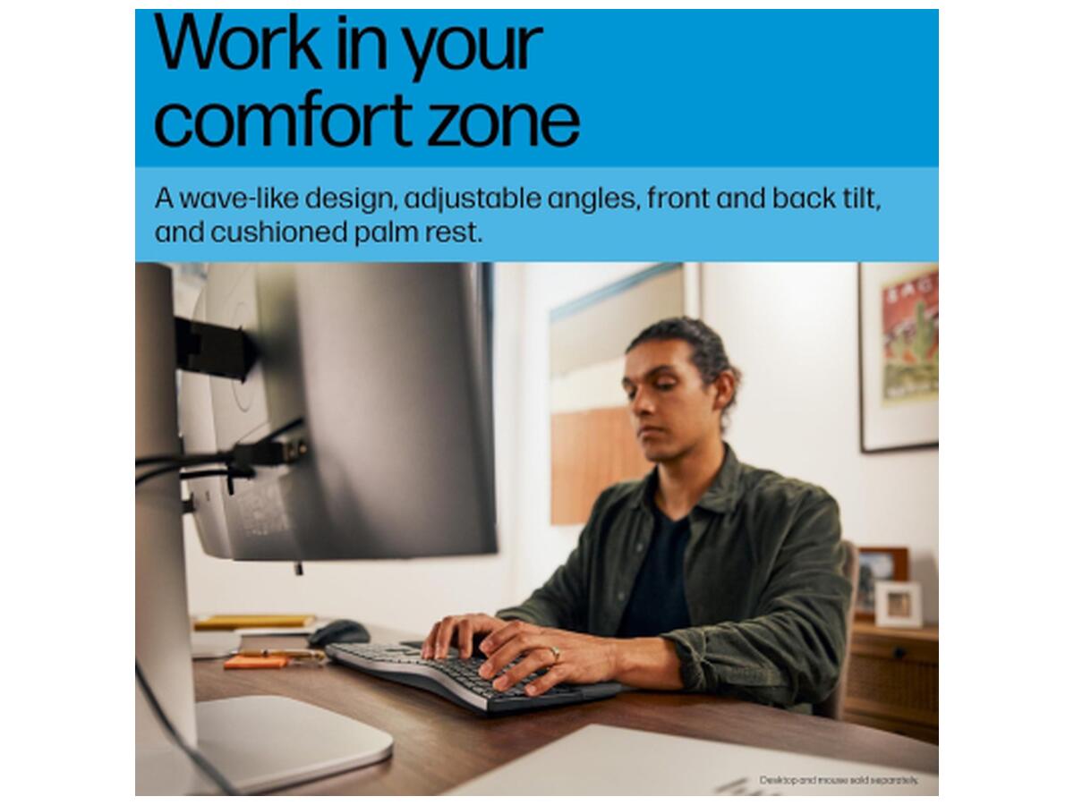 Ця повнорозмірна клавіатура від HP стане відмінним вибором для тих, хто цінує комфорт та функціональність. Завдяки інноваційному хвилеподібному дизайну та м’якій підставці для зап’ясть, модель забезпечує максимальну зручність під час тривалої роботи за комп’ютером. Користувач може обрати один із трьох кутів нахилу, адаптуючи пристрій під власні уподобання. Підтримка подвійного режиму підключення — через Bluetooth та HP Unifying Dongle — дозволяє легко переключатися між кількома пристроями, підвищуючи ефективність роботи.