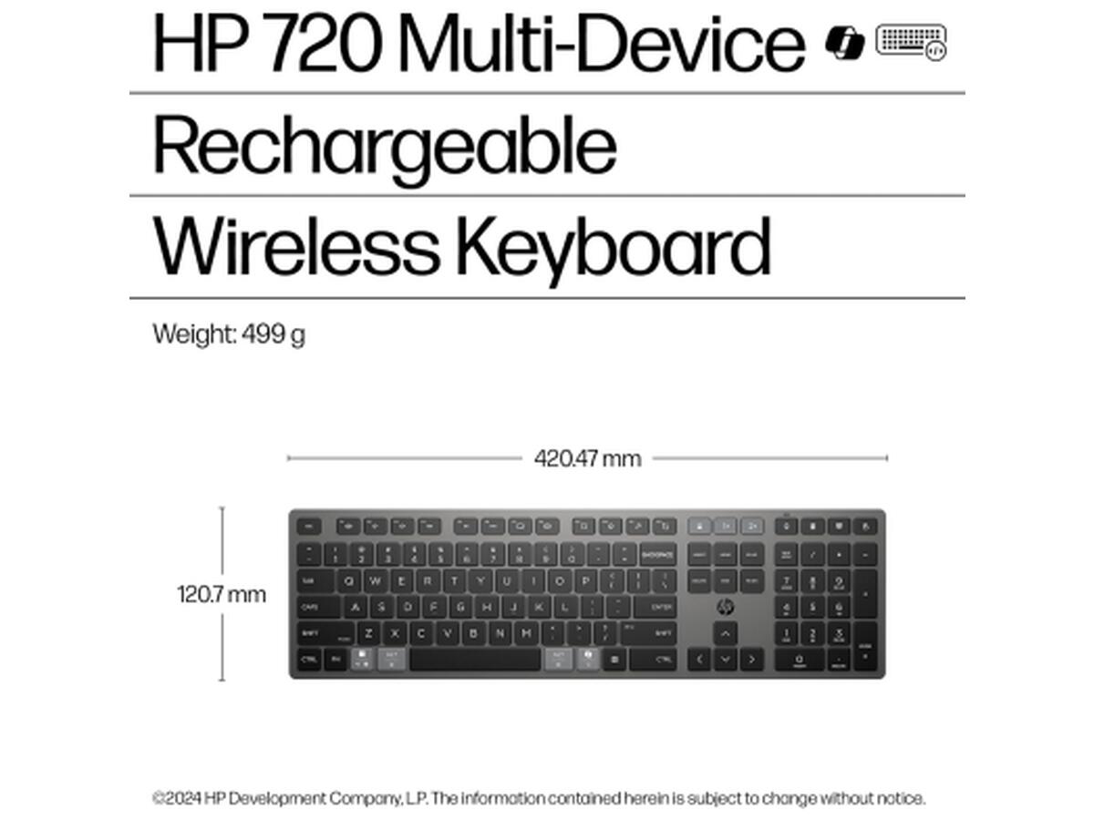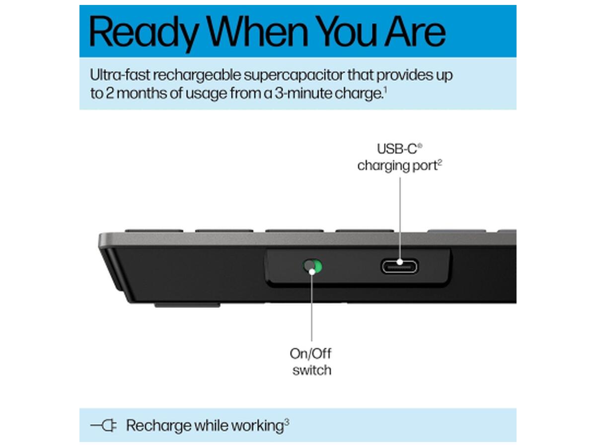 Відкрийте для себе зручність роботи з клавіатурою HP 720, яка підтримує підключення через Bluetooth та USB-адаптер 2.4 ГГц. Вона оснащена акумулятором з швидкою зарядкою, що дозволяє тривалий час користуватись пристроєм без необхідності постійної підзарядки.