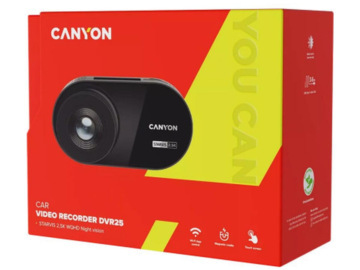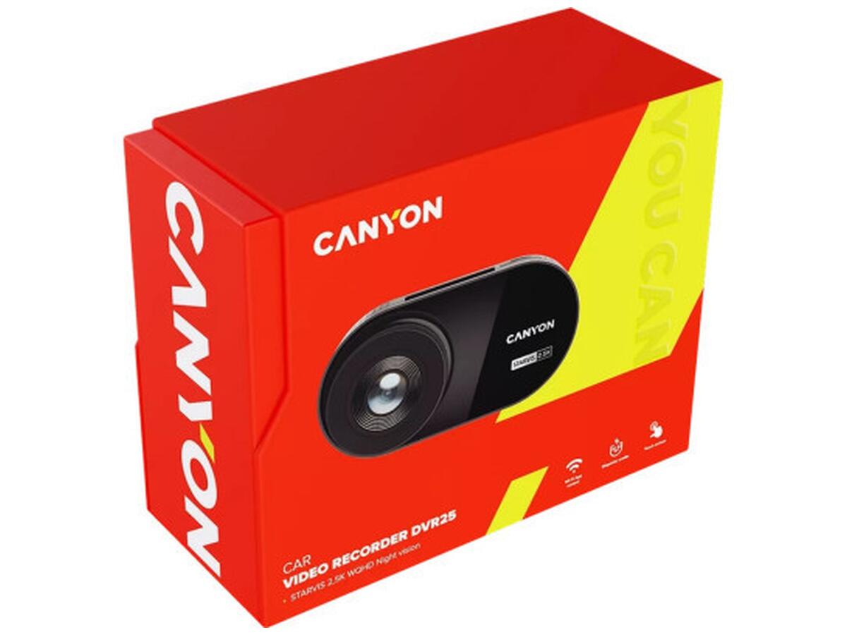 Сучасний відеореєстратор Canyon DVR25 поєднує високу якість зйомки та зручність у використанні. Завдяки камері з сенсором Sony335, пристрій записує відео у роздільній здатності до 2560x1440 пікселів і має широкий кут огляду 140°, що дозволяє охопити максимальний простір дороги.