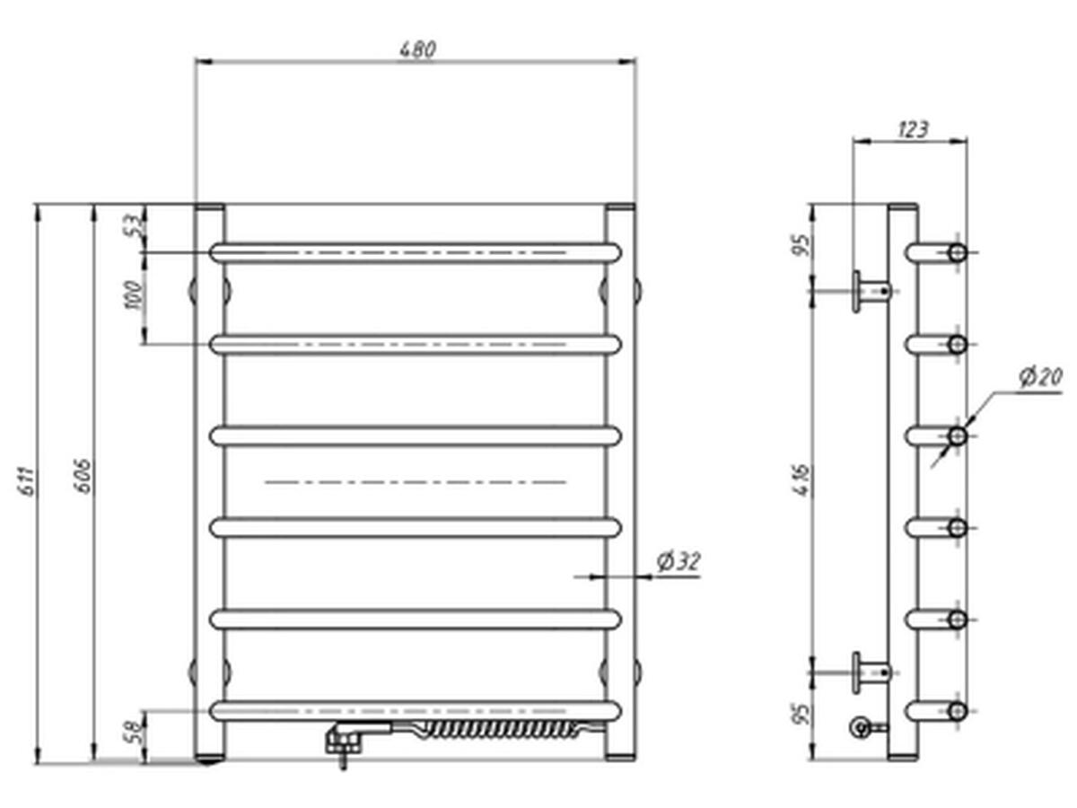 Габарити рушникосушки: 600 мм висота, 480 мм ширина, 123 мм глибина. Монтаж можливий з правого боку з підключенням діаметром 1/2". Виробництво — Україна. Гарантійний термін — 60 місяців.